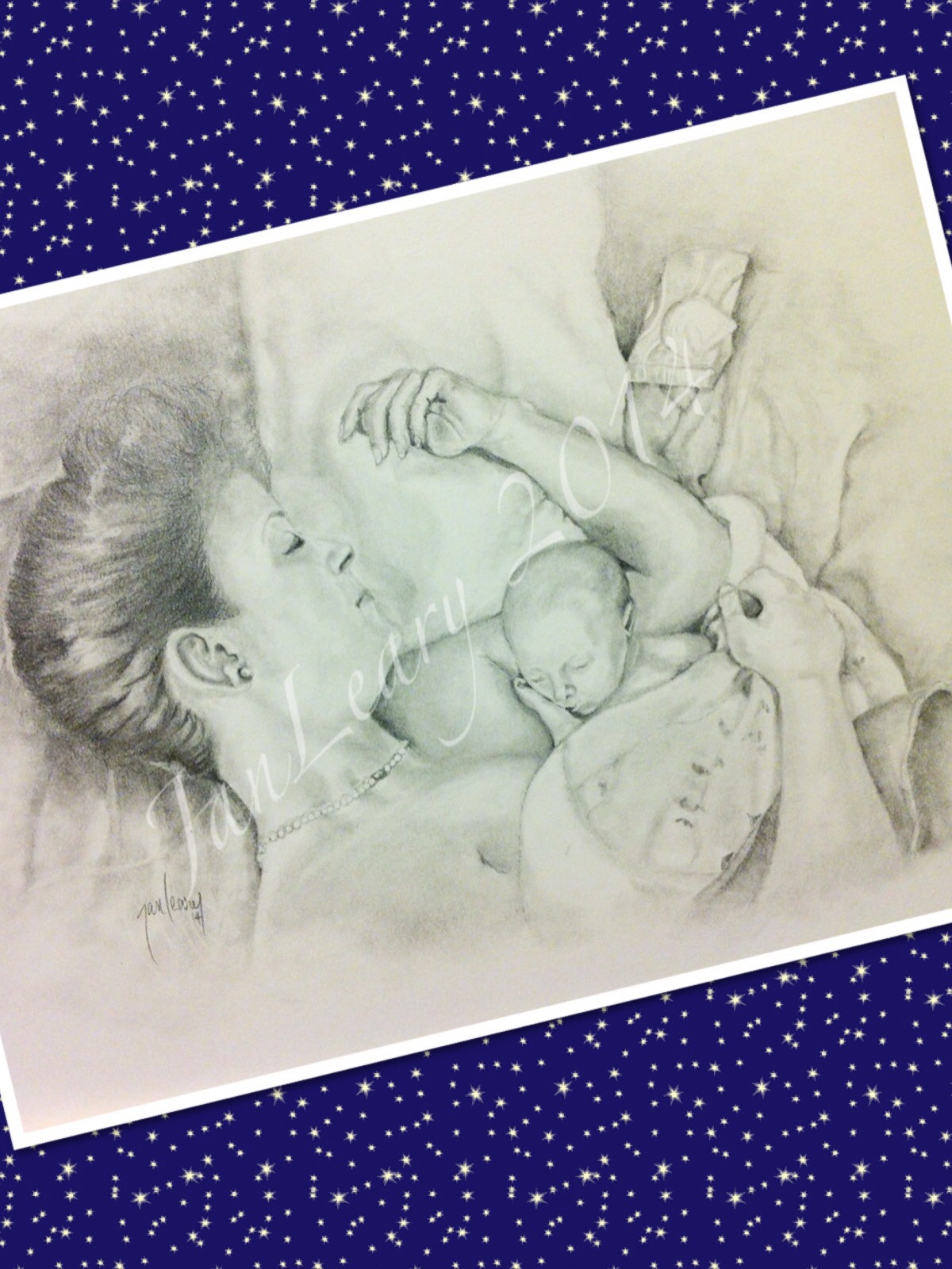 I was asked to draw one of my favorite types of portraits (Mother and Child), for a first time mom as of one month ago. It was also a first for me in that the photo had much detail, which could tend to look extremely murky, in my opinion, when using graphite. In the end, the recipient was happy, so, I was too.