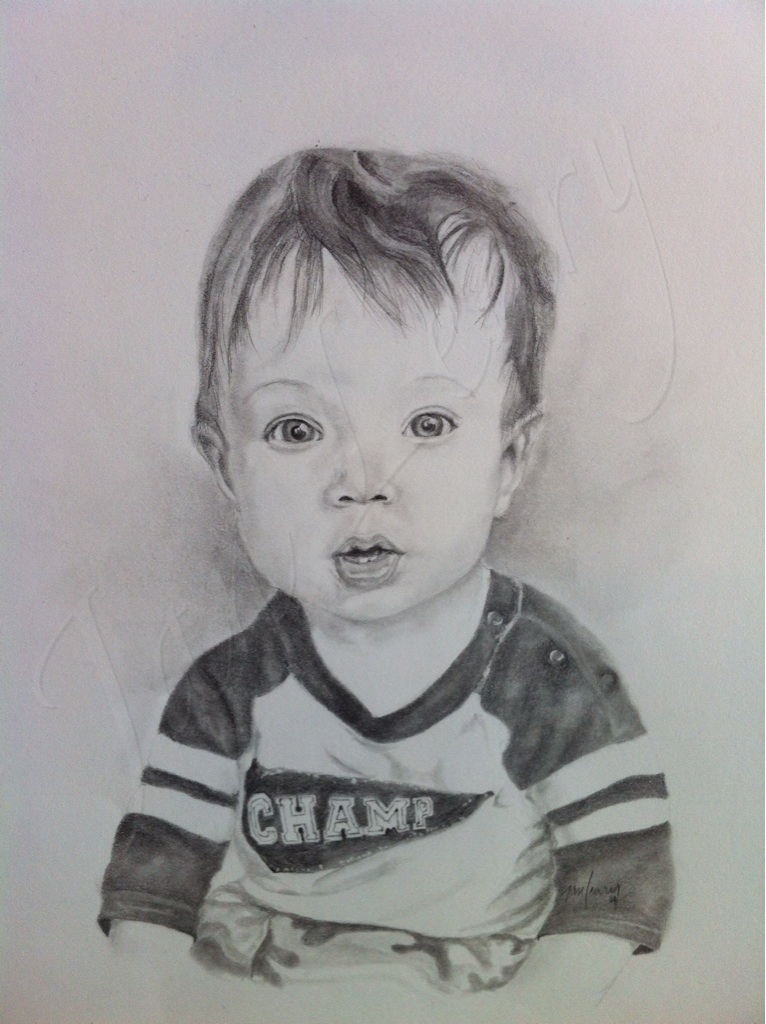 Wonderment!… That is what I saw I this child’s eyes. Think about it…at 1 or 2 years old nearly everything you see or do each day is NEW, an adventure… a first time doing it or seeing it. The photo of this child expressed that wonderment perfectly. In this photo, he had placed both legs into one leg of a pair of camouflage pants and was thinking about how to resolve the problem. 😊  I love drawing pictures that might in the future bring joyful memories.